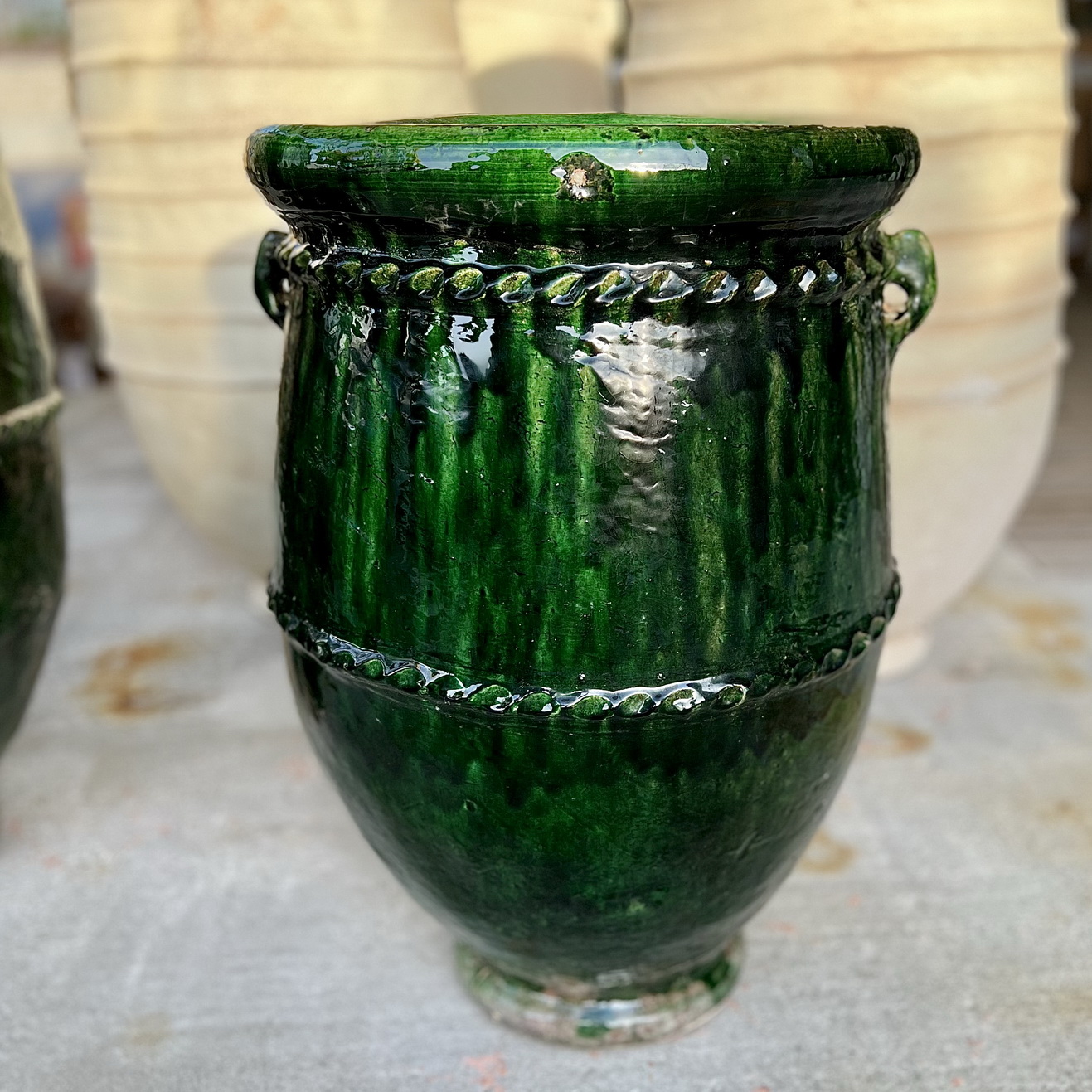 Cette jarre en terre cuite, fabriquée dans un four traditionnel creusé dans la terre, se distingue par sa belle finition émaillée vert émeraude.
