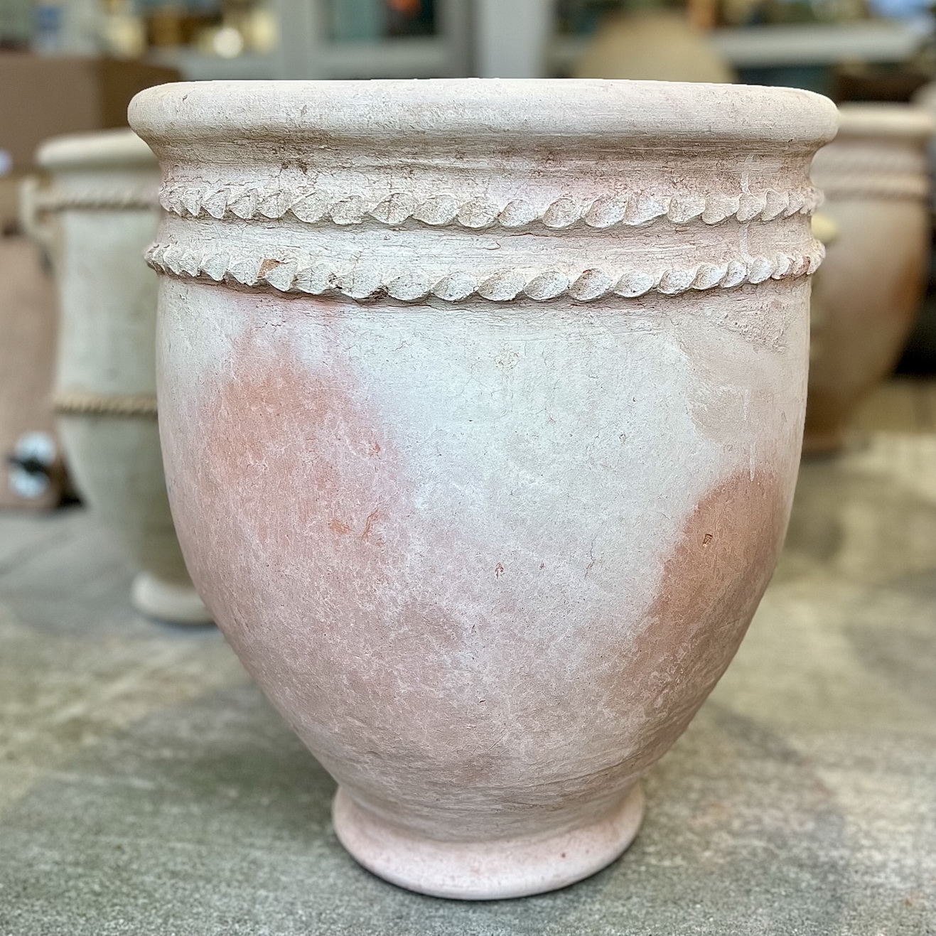 Sa base évasée en terre cuite est ornée de deux cercles en relief, elle se distingue par son style authentique.