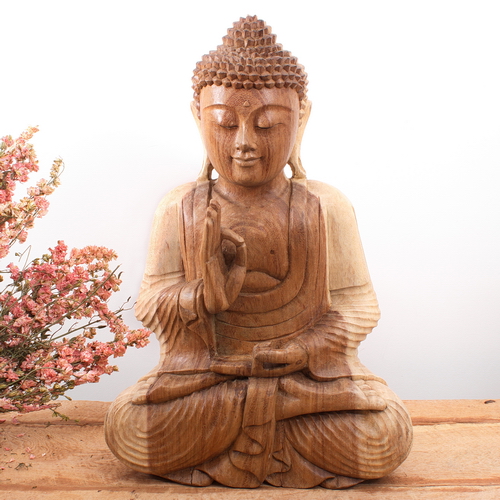 Créez une ambiance zen et reposante dans votre décoration intérieure avec cette superbe sculpture de Bouddha d'une hauteur de 50 cm assis en position du lotus et mudra Vitarka, geste de l’argumentation, de l’explication de la loi. On aime la finesse du détail, une statue qui dégage naturellement douceur et sérénité. Réalisée de façon artisanale sur l’île de Bali, chaque pièce est unique.