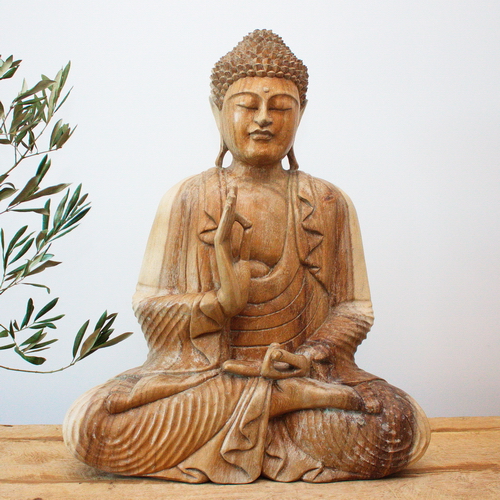 Apportez une touche zen et élégante à votre décoration intérieure avec cette superbe sculpture de Bouddha d'une hauteur de 60 cm, mudra Vitarka, geste de l’argumentation, de l’explication de la loi.On aime la finesse du détail, les différentes teintes du bois de suar qui lui donne un charme particulier.
