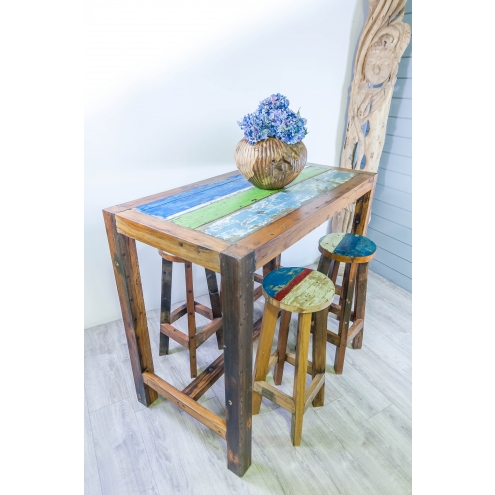 Dynamisez l’ambiance de votre cuisine ou séjour et ajoutez une touche gaie et colorée avec cette table haute en lames de teck d'une longueur 140 x H. 110 x P 80 cm réalisée de façon artisanale à partir de bois de pirogues recyclées indonésiennes. Une pièce unique avec chacune ses propres couleurs d'origine et son histoire qui sonne comme une invitation au voyage. Meuble central de votre ambiance intérieure, elle ne manquera pas d’attirer les regards de vos invités.