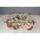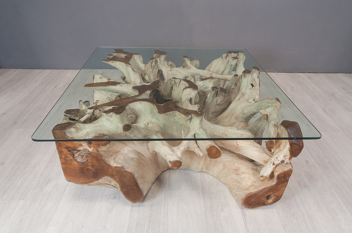 Jouez le naturel et l'originalité avec cette magnifique table basse carrée en racine de teck naturel, en finition blanchie avec son plateau en verre carré. Elle sera incontestablement la pièce maîtresse de votre salon.