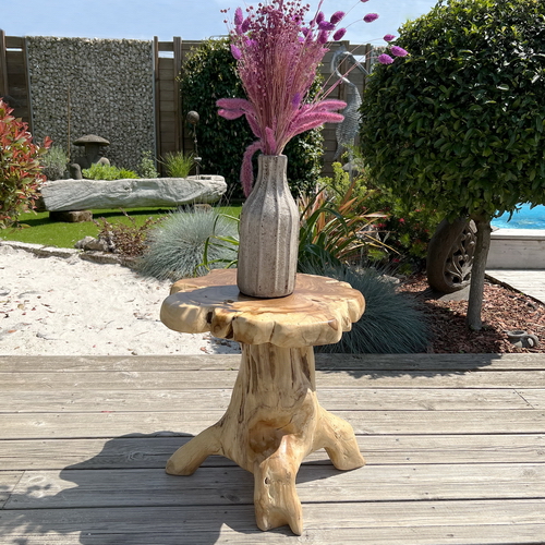 Ce meuble d'appoint original aux formes authentiques et naturelles de 45 cm de haut fabriqué artisanalement apportera à la décoration intérieure ou votre espace extérieur une touche exotique, singuliere et inhabituelle.
