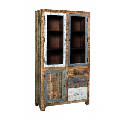 Vitrine d'une belle largeur de 100 et d'une hauteur de 185 cm en manguier, bois très prisé pour sa solidité et son label écologique, vous aimerez cette patine légèrement colorée d'un subtil ton blanchi et gris bleuté qui lui confère à la fois un style bord de mer et contemporain, on aime bien la douceur et le charme de ses lignes épurées. Doté de 2 portes vitrées, d'une pleine et de 3 tiroirs, ce meuble vous permettra d'y ranger pas mal de choses et d'exposer vos plus beaux objets aussi bien dans un salon, salle à manger ou bureau.